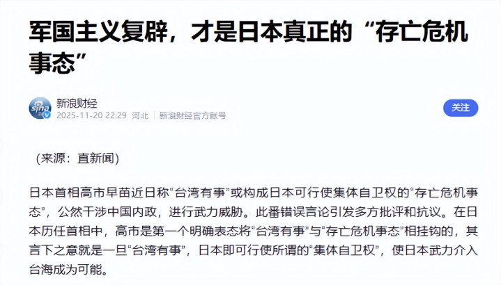 高市早苗此前那句“台湾有事即为日本存亡事态”的表态,等于给日本自卫队下达了战争动员前夜的“预警命令”,这是在玩火,而且是拿全体国民的命,烧自己仕途上的香火。