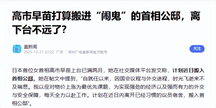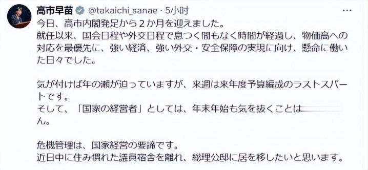 从政治牌桌上看,高市已经失去了再反击的资本。她想用“居住首相公邸”来传达“我还稳坐钓鱼台”的象征意义,但效果反而极其讽刺。