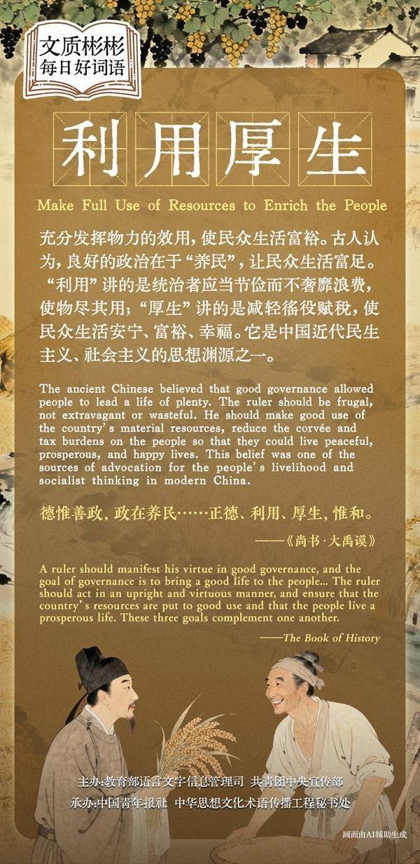 充分发挥物力的效用振兴资本,使民众生活富裕。古人认为,良好的政治在于“养民”,让民众生活富足。“利用”指统治者应当节俭而不奢靡浪费,使物尽其用;“厚生”指减轻徭役赋税,使民众生活安宁、富裕、幸福。它是中国近代民生主义、社会主义的思想渊源之一。