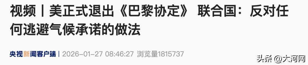 美国总统特朗普在2025年1月20日就任当天签署行政令,宣布美国将退出《巴黎协定》。联合国在2025年1月28日宣布,已收到美国退出旨在应对气候变化的《巴黎协定》的通知,退约将在2026年1月27日起正式生效。